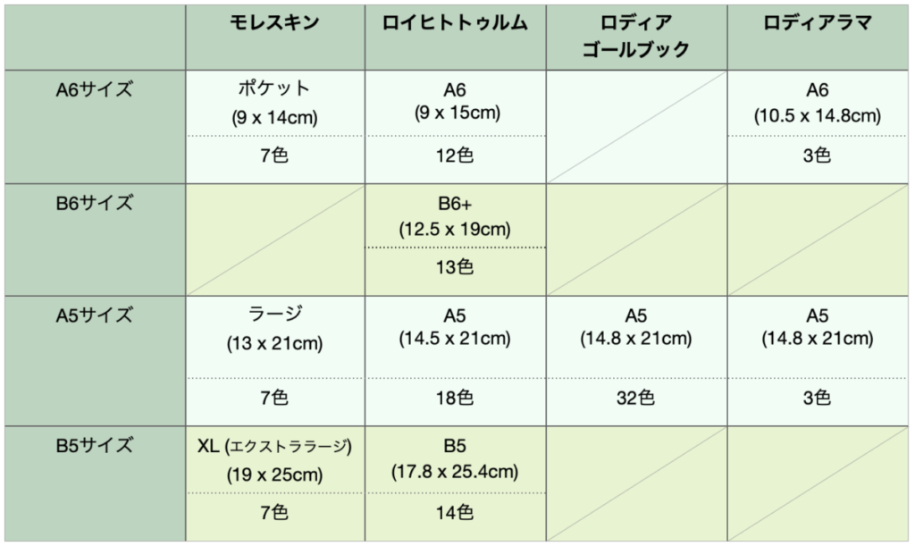 3社とも独自のサイズ展開がなされています。一応はA5、A6などの国際規格サイズに沿っているものの、長さや幅に長短があったりと、多少の自由が見られます。