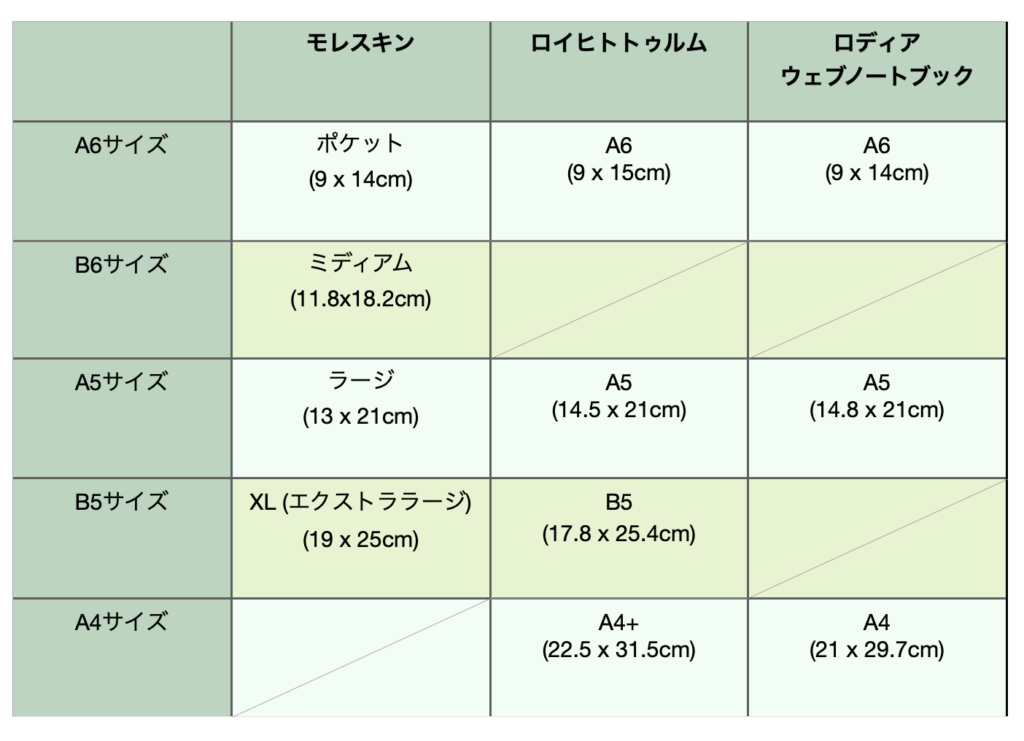 3社とも独自のサイズ展開がなされています。一応はA5、A6などの国際規格サイズに沿っているものの、長さや幅に長短があったりと、多少の自由が見られます。